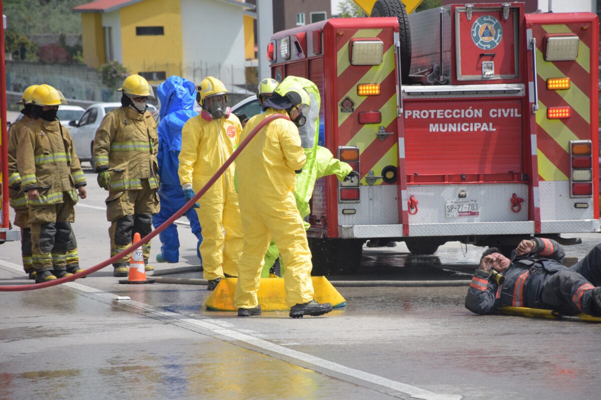 En el ejercicio, se simuló una fuga de amoniaco con un lesionado dentro de una pipa. Fue rescatado, descontaminado y trasladado a un hospital, como parte del procedimiento.