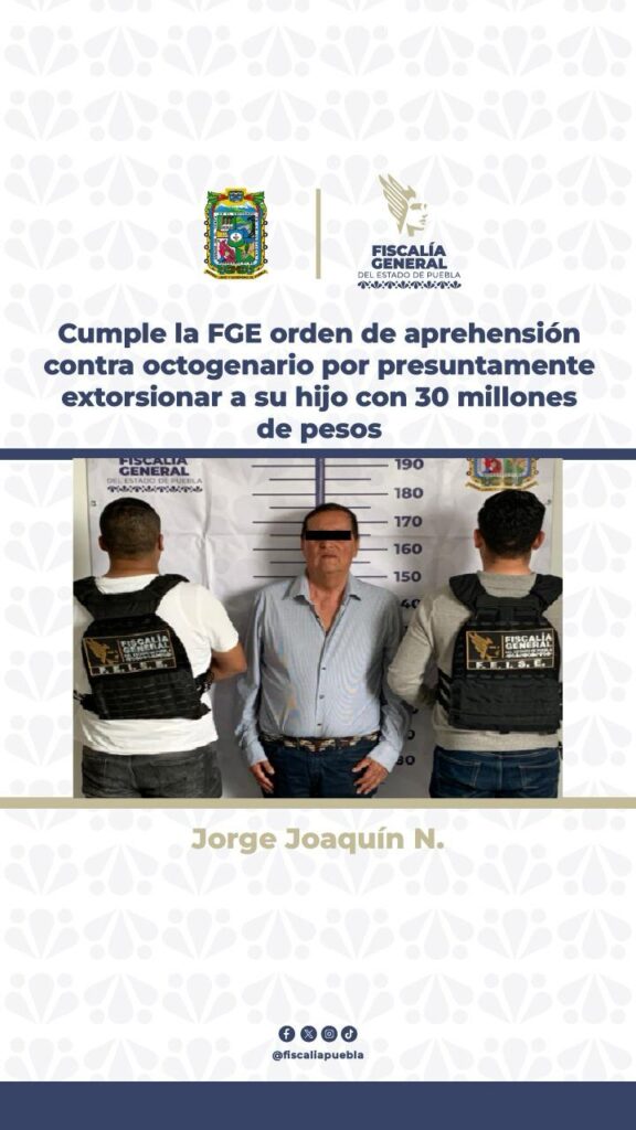 La Fiscalía General del Estado (FGE) cumplió la orden de aprehensión contra Jorge Joaquín N., de 81 años, por presunta extorsión en agravio de su hijo.
