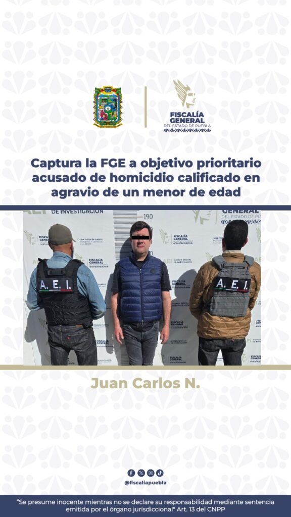 La Fiscalía General del Estado (FGE) informó la detención de Juan Carlos N., de 43 años, identificado como objetivo prioritario por homicidio calificado de un menor de edad.