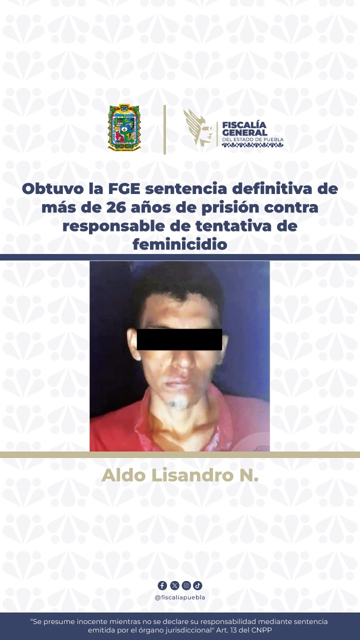 La Fiscalía General del Estado (FGE) de Puebla obtuvo sentencia definitiva de 26 años y 8 meses de prisión contra Aldo Lisandro N., responsable de la tentativa de feminicidio en perjuicio de una mujer adulta mayor.