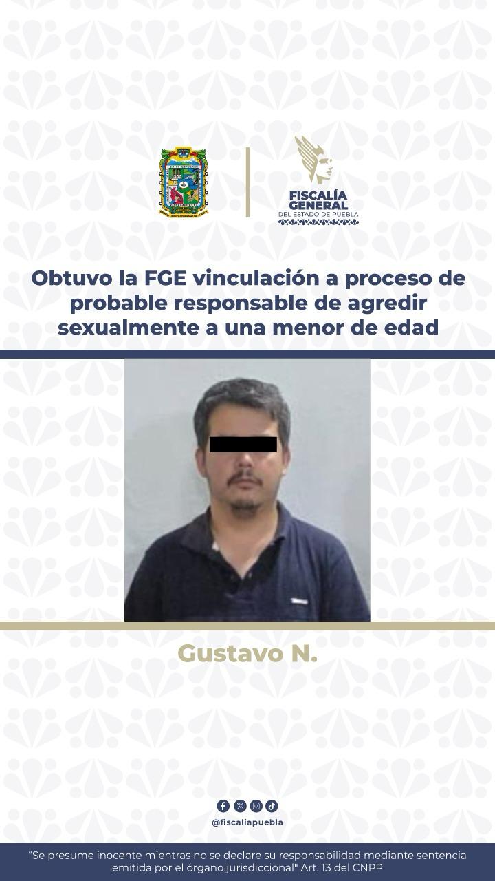 La Fiscalía General del Estado de Puebla (FGE) informó la vinculación a proceso de Gustavo N., señalado como probable responsable de agredir sexualmente a una menor de edad.