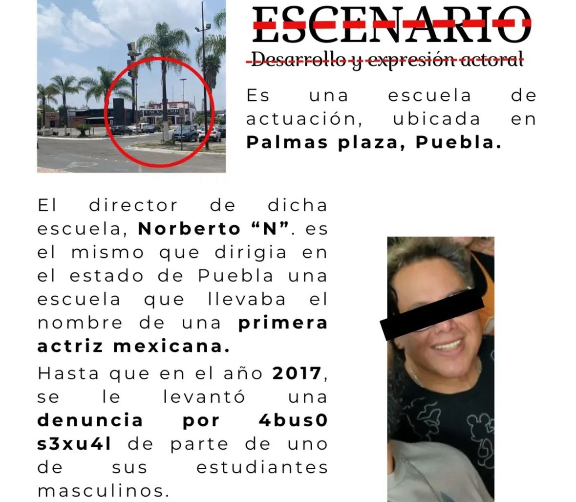 Mediante la cuenta @denunciaarte_escenario de Instagram, se dieron a conocer las denuncias anónimas de algunas víctimas, en las que aseguraron que, mediante un “método actoral”, el director, Norberto N, permitía que uno de sus maestros las masturbara sin su consentimiento y las incitaba a tener orgasmos, bajo la justificación de que, a través de esto, tendrían un buen desempeño en escena.