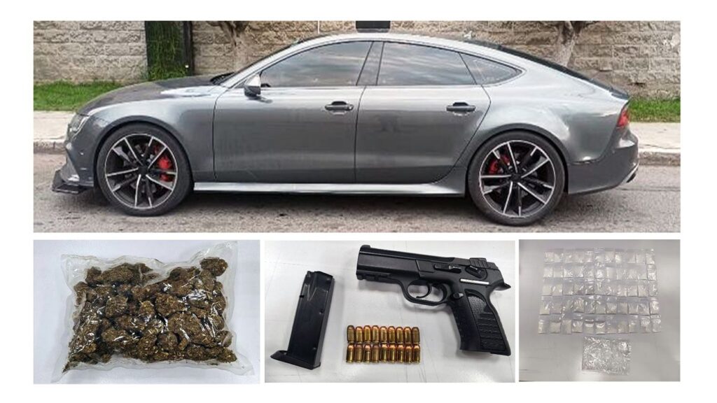 Durante la detención, se le aseguraron 67 bolsas con cristal o metanfetamina, 55 con cocaína, un envoltorio con marihuana, además de un arma de fuego calibre .380 con 18 cartuchos.