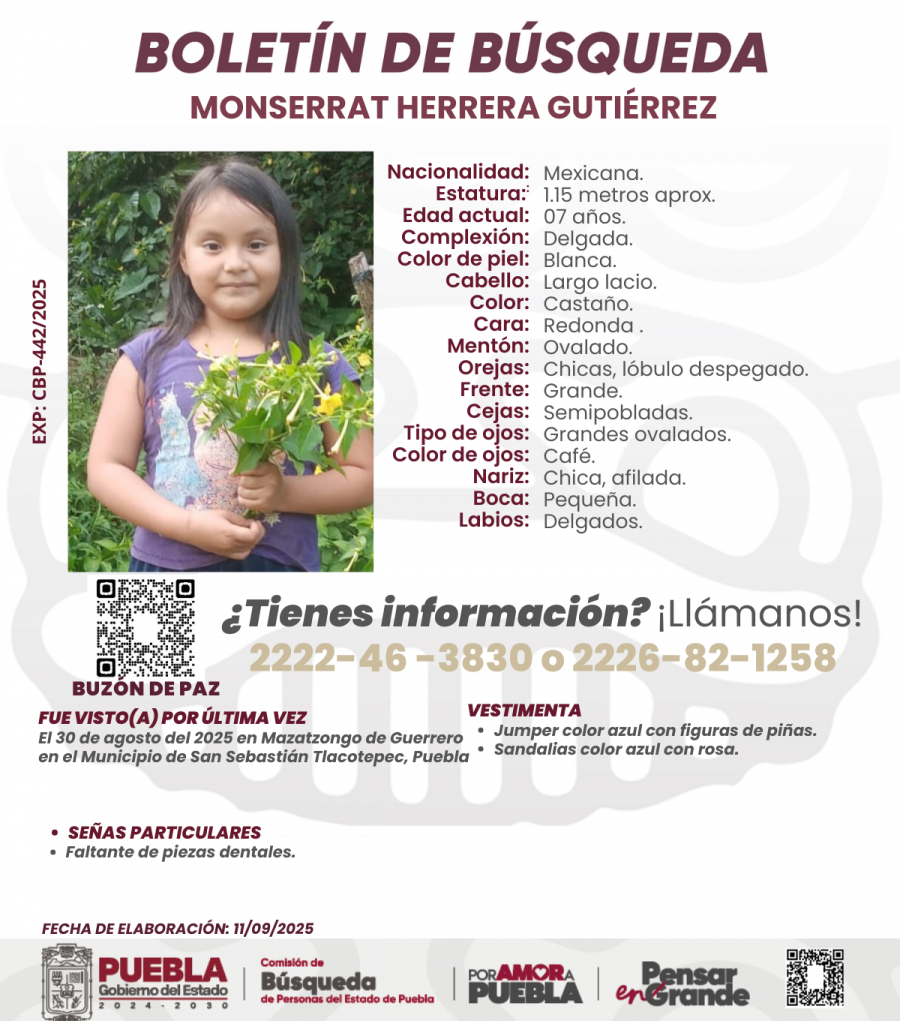 Autoridades estatales y municipales mantienen activo un operativo de búsqueda en los límites de los estados de Puebla y Oaxaca para localizar a la menor Montserrat Herrera Gutiérrez, de 7 años, quien el pasado 30 de agosto fue arrastrada por la corriente del río Petlapa en la comunidad de Mazatzongo de Guerrero, municipio de Tlacotepec de Porfirio Díaz, en la Sierra Negra del estado.
