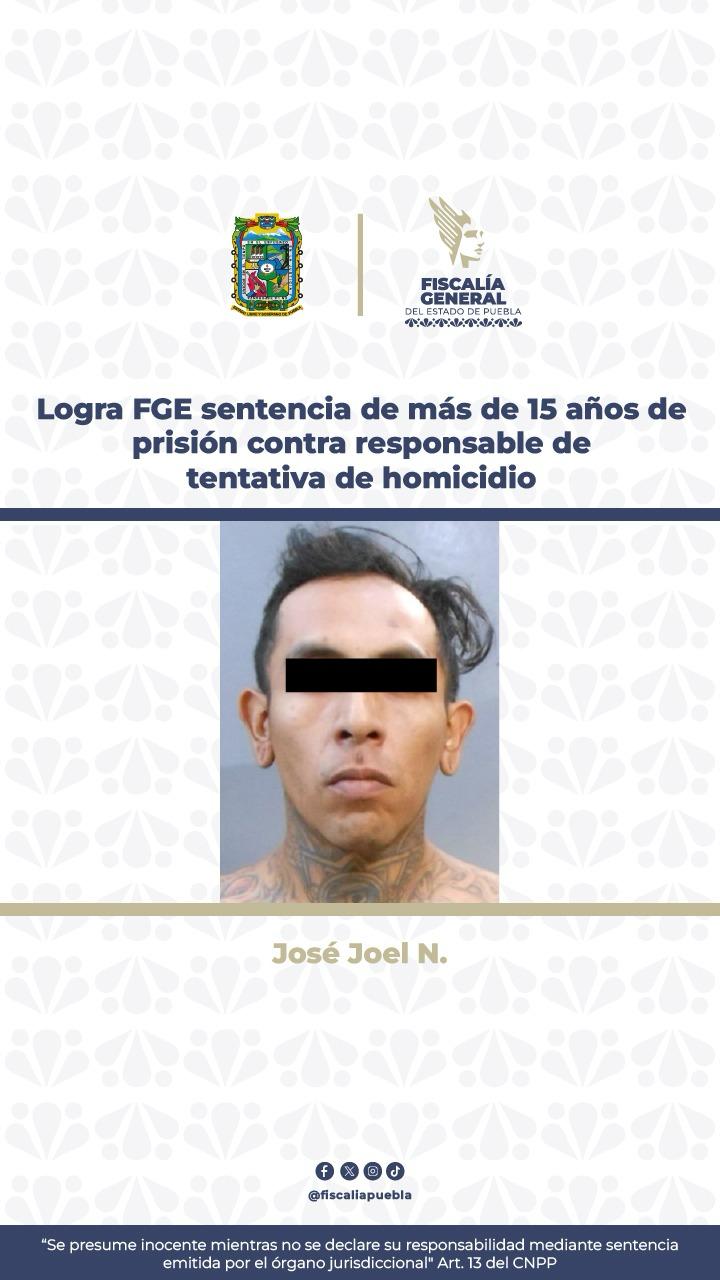La Fiscalía General del Estado de Puebla logró una sentencia de 15 años y 10 meses de prisión contra José Joel N., declarado culpable del delito de homicidio calificado en grado de tentativa, en agravio de dos personas en la colonia Lomas de San Valentín, en la ciudad de Puebla.