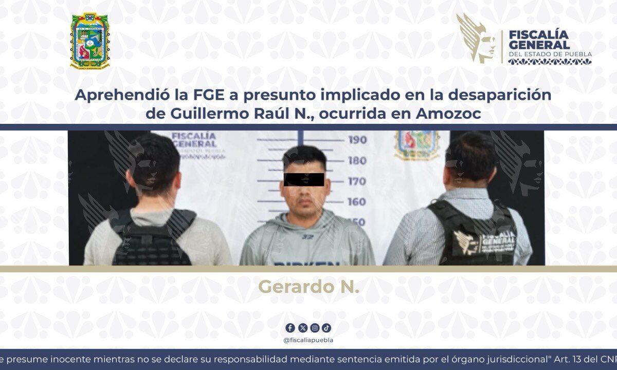 La Fiscalía General del Estado de Puebla informó la detención de Gerardo N., presunto implicado en la desaparición de Guillermo Raúl N., ocurrida en Amozoc en 2023. La víctima fue vista por última vez en diciembre de 2023, cuando acudió al domicilio de José Wulfrano Ulises N. para venderle una laptop, según la investigación ministerial. […]