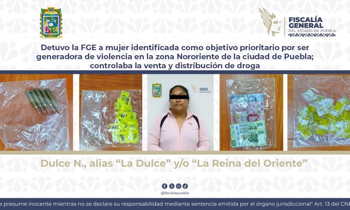 La Fiscalía General del Estado de Puebla detuvo a Dulce N., alias “La Dulce” o “La Reina del Oriente”, señalada como objetivo prioritario por su papel como presunta generadora de violencia en la zona Nororiente de la capital. La aprehensión ocurrió el 22 de mayo, en Chachapa, Amozoc, cuando fue sorprendida con 106 envoltorios de […]