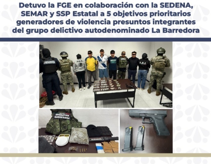 La Fiscalía General del Estado (FGE) de Puebla, en coordinación con la SEDENA, SEMAR y la SSP Estatal, detuvo a cinco personas identificadas como objetivos prioritarios por ser generadores de violencia en la entidad. Los detenidos son presuntos integrantes del grupo delictivo "La Barredora", vinculado con homicidios, secuestros y distribución de droga en la zona […]
