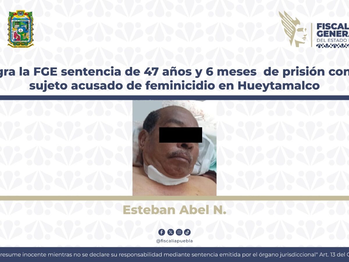 La Fiscalía General del Estado de Puebla (FGE) logró que quedara firme una sentencia condenatoria de 47 años y 6 meses contra un hombre acusado de feminicidio en Hueytamalco. El responsable, identificado como Esteban Abel N., fue hallado culpable del asesinato de su pareja sentimental, ocurrido el 5 de septiembre de 2021 en la colonia […]
