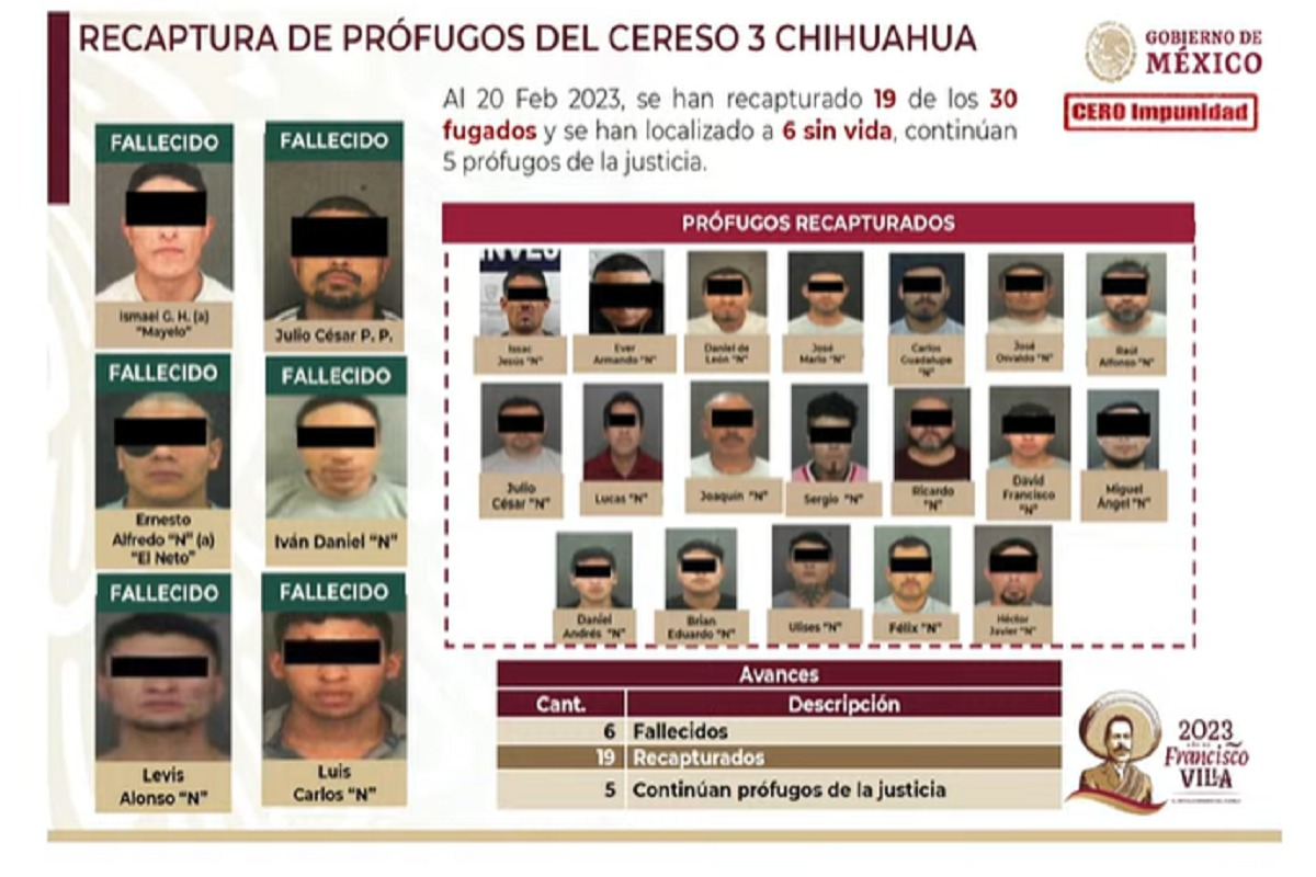 De los 30 reos fugados, el 1 de enero del Cereso 3 de Chihuahua, a la fecha permanecen cinco sin poder ser capturados, anunció el subsecretario de Seguridad Pública de la Secretaría de Seguridad y Protección Ciudadana (SSPC), Luis Rodríguez Bucio. Al presentar el informe de seguridad destacó que seis de han localizado sin vida. […]