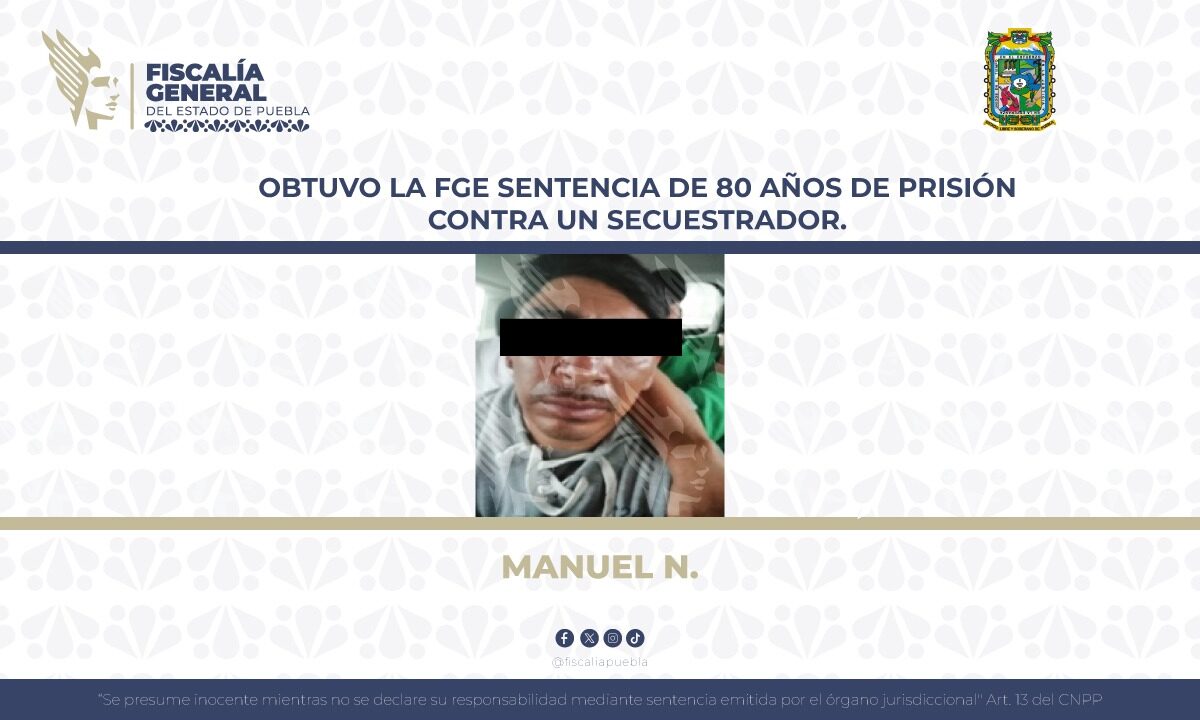 La Fiscalía General del Estado de Puebla (FGE) obtuvo una sentencia de 80 años de prisión contra Manuel N., responsable de un secuestro y homicidio ocurrido en 2019 en el municipio de Tianguismanalco. De acuerdo con la investigación, Manuel N. y su grupo delictivo interceptaron a la víctima en la carretera Huejotzingo – San Martín […]
