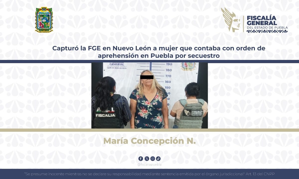 La Fiscalía General del Estado de Puebla informó la detención de María Concepción N. en Nuevo León, por su presunta participación en un secuestro agravado ocurrido en 2017. Los hechos se registraron el 6 de noviembre de 2017 en la ciudad de Puebla, cuando la víctima fue privada de su libertad y trasladada a un […]