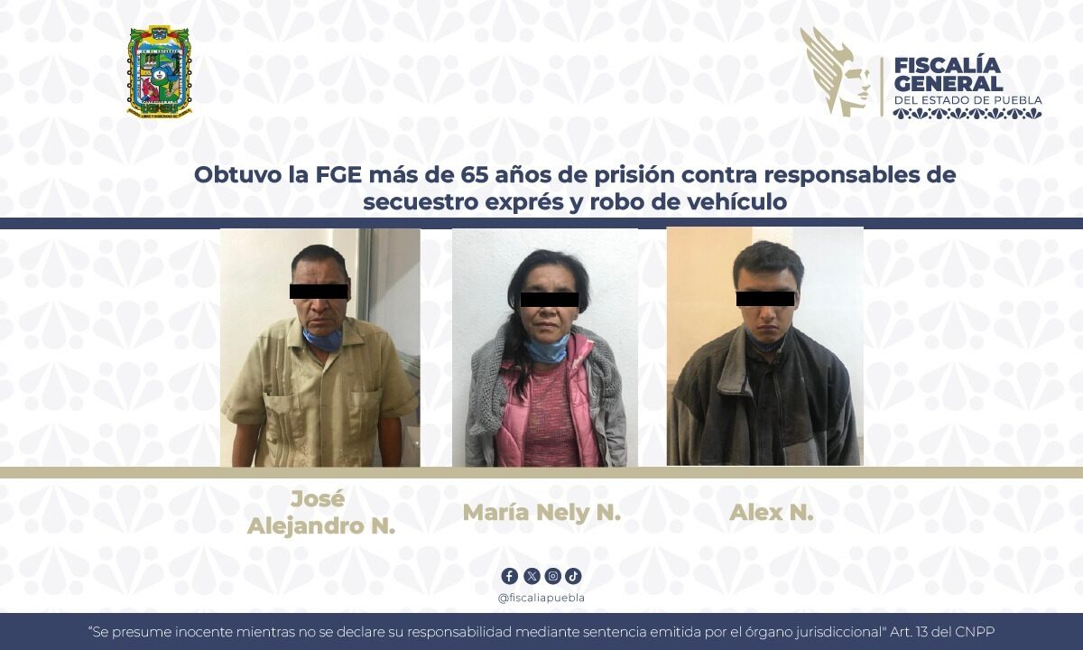 La Fiscalía General del Estado (FGE) obtuvo una sentencia de más de 65 años de prisión contra tres responsables de secuestro exprés agravado y robo de vehículo agravado. Los sentenciados, José Alejandro N., María Nely N. y Alex N., fueron hallados culpables por privar de la libertad a tres personas y robar una camioneta Chevrolet […]