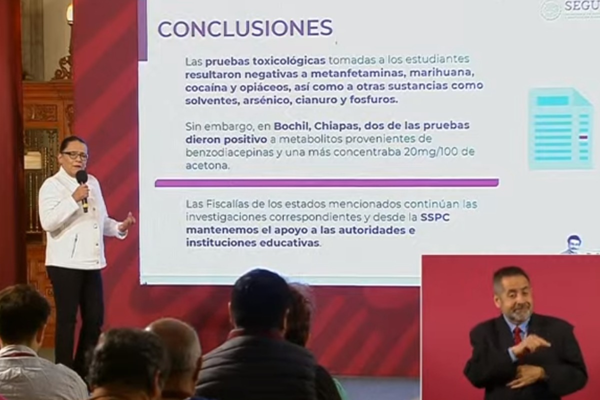 La Secretaría de Seguridad y Protección Ciudadana (SSPC) descartó consumo de drogas en tres de las cuatro escuelas donde hubo intoxicación de alumnos. Así lo informó este martes la titular de la SSPC, Rosa Icela Rodríguez, quien dijo que tras someter a los jóvenes a exámenes toxicológicos: “Las pruebas toxicológicas tomadas a los estudiantes resultaron […]