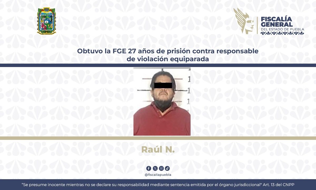La Fiscalía General del Estado de Puebla (FGE) obtuvo una sentencia de 27 años y 6 meses de prisión contra Raúl N., por el delito de violación equiparada. Los hechos ocurrieron en el municipio de Chignahuapan, donde el ahora sentenciado agredió a un menor de edad, a quien conocía con anterioridad. Según las investigaciones, en […]